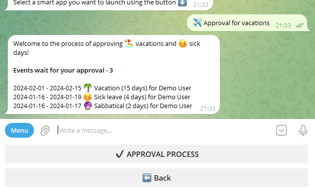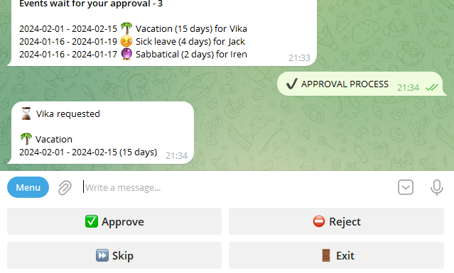 Now you can approve vacations, sick leaves, days off, and other events for the entire team in the work chat