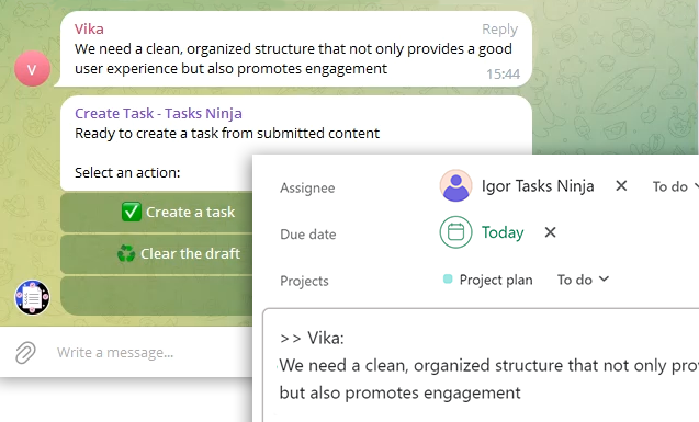 It is happening pretty often when valuable ideas and thoughts expressed during work chat communication, you can select the best pieces and turn it to task in your task management software